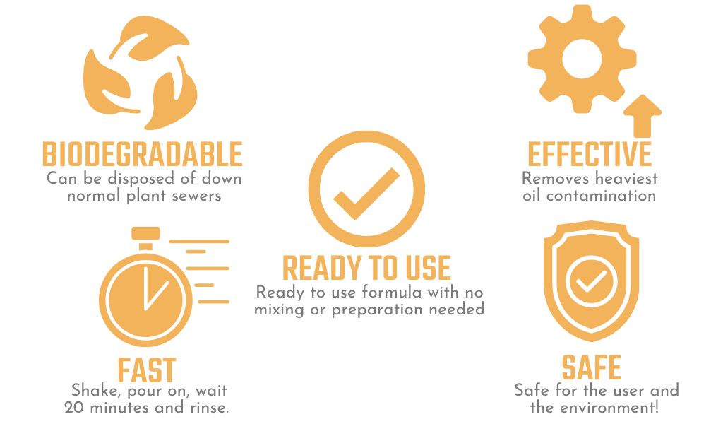 Quick and easy to use: Fast-acting grease and heavy oil remover. Ready to use formula with no mixing or preparation needed. Water rinsable and separator friendly.