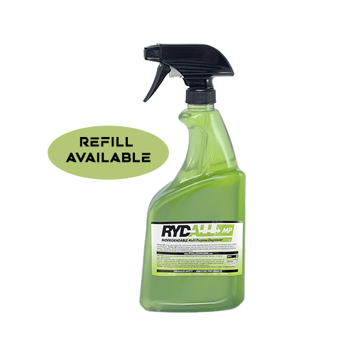 Liberally spray on virtually any water washable surface and let sit for 20-30 seconds. Wipe clean and rinse with water. For stubborn stains, repeat the procedure. It is as safe and as simple as that! The reason for the short wait time is because the RYDALL MP is a highly effective oil and fat remover that is able to crawl under the residues on machines and equipment. This Multi-Purpose degreaser/cleaner includes specially modified additives for improved oil holding capacity, low foam, and maximum surface wetting. When sprayed on the equipment, RYDALL MP starts to soak around and underneath the oily accumulations, lifting them from the surface allowing the deposits to be wiped and/or rinsed away!
